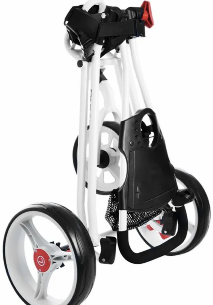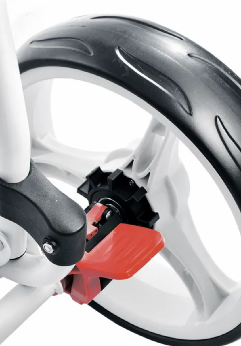 The popular Eze Glide golf trolley range presents the Eze Glide Cruiser. The easy push design and 10 inch true glide ball bearing wheels ensure a straight and smooth glide across the course, minimizing effort and strain while preventing injuries. The trolley features an adjustable bag bracket and an L shaped base that is able to support your golf bag and equipment securely without risk of tipping over.