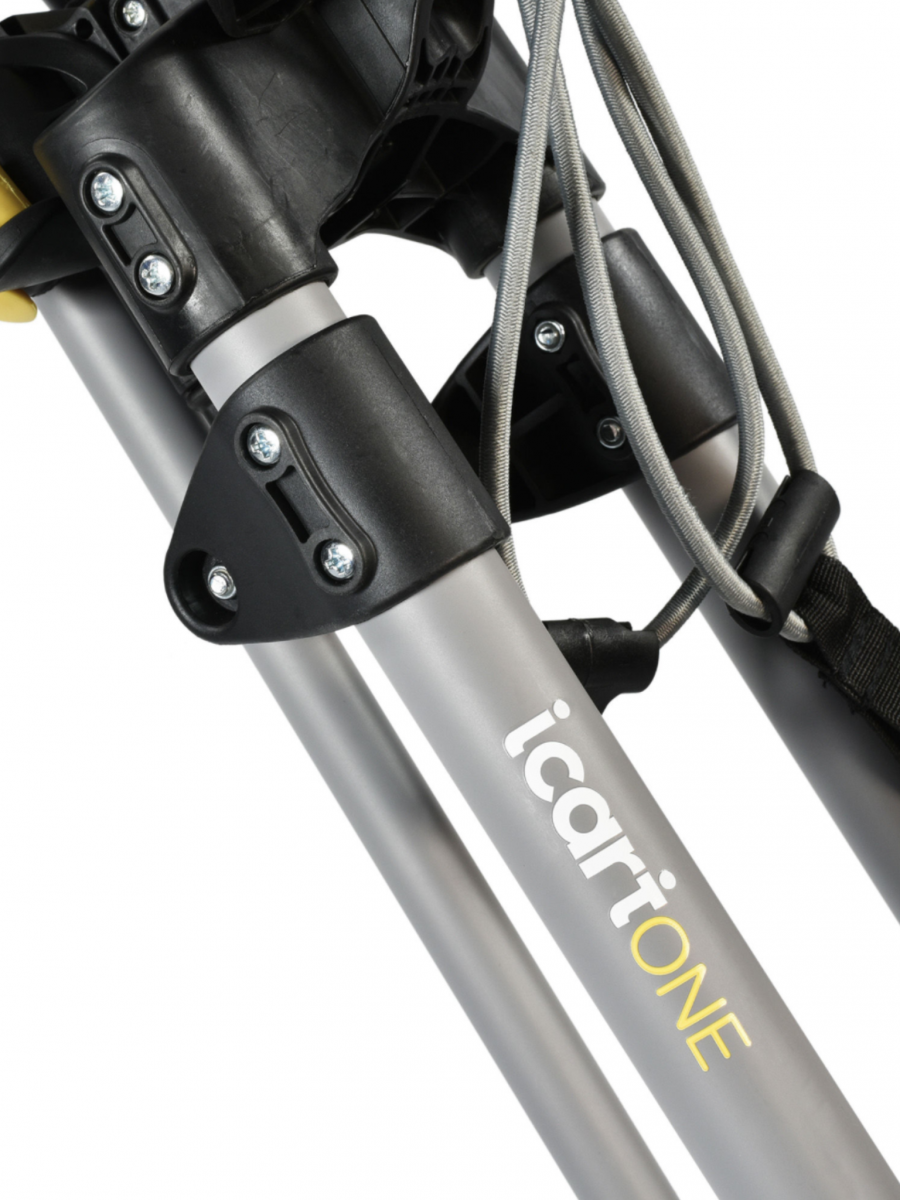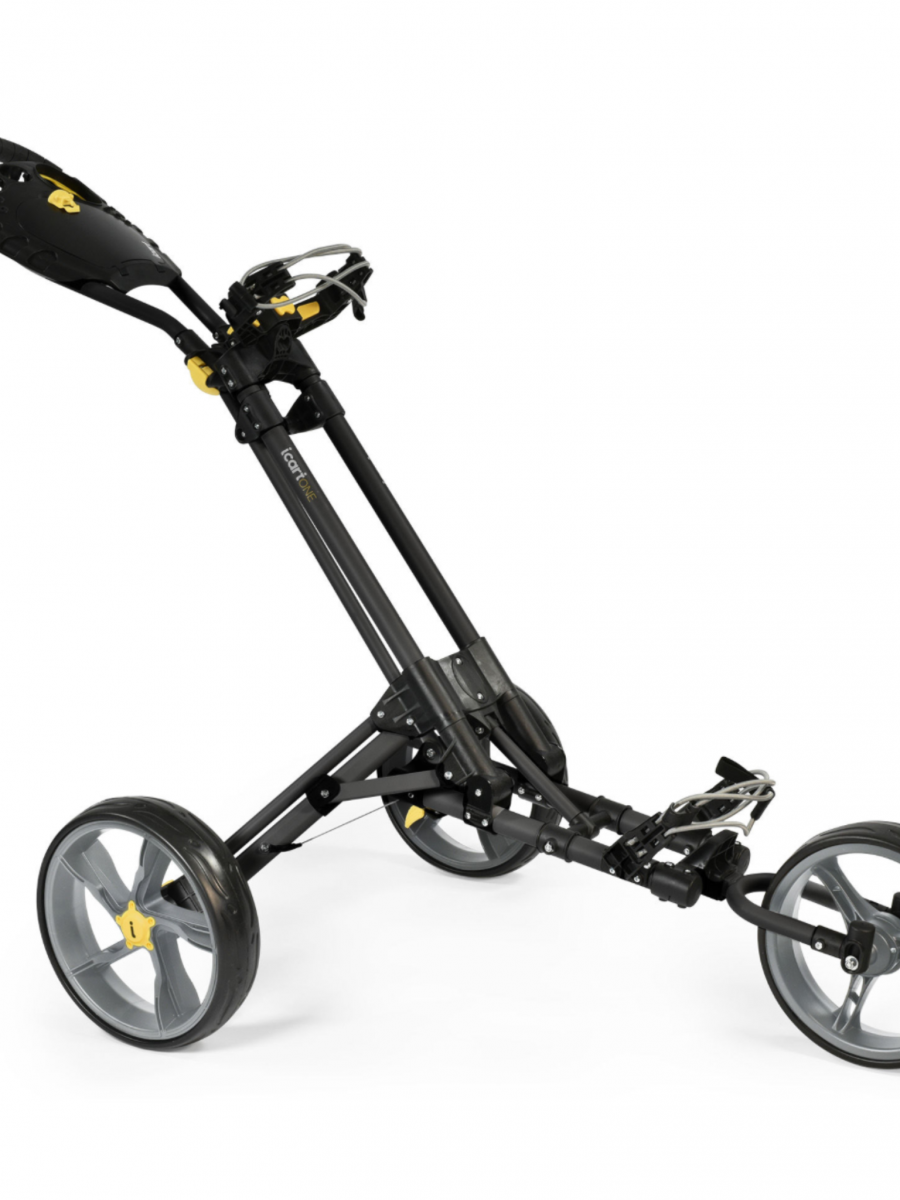 A one click mechanism allows the iCart One to collapse and open with ease. Lightweight, quick folding design provides ease of use. Wide trolley base when open gives great stability and manoeuvrability when out on course. Features universal umbrella attachment.